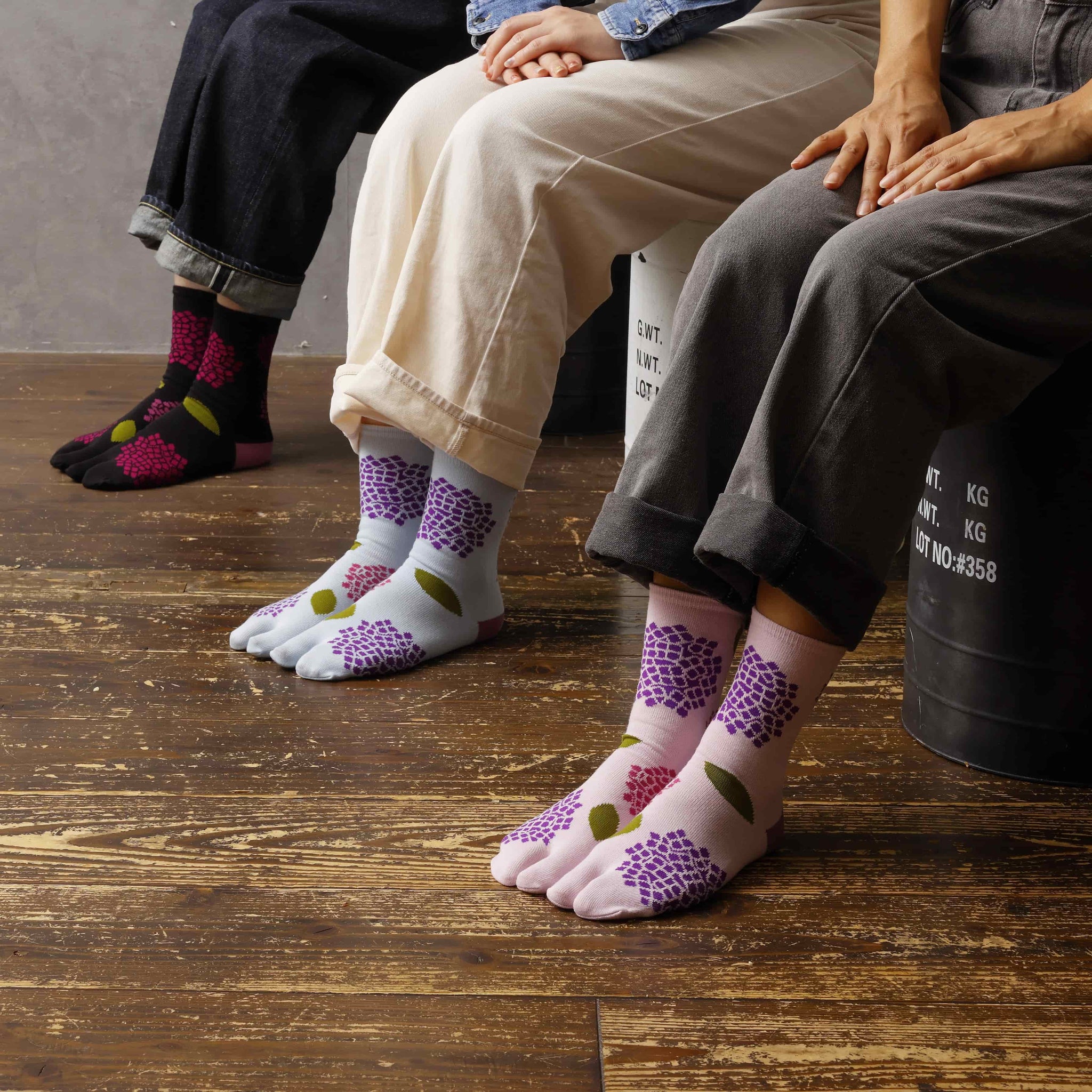 Shop TABI-JI's original “Kamakura” design socks. The design features "hydrangeas" that add color to summer in Japan, and is available in three colors: light shades of pink and blue, and black with a hydrangea pattern, in crew and ankle-length versions.