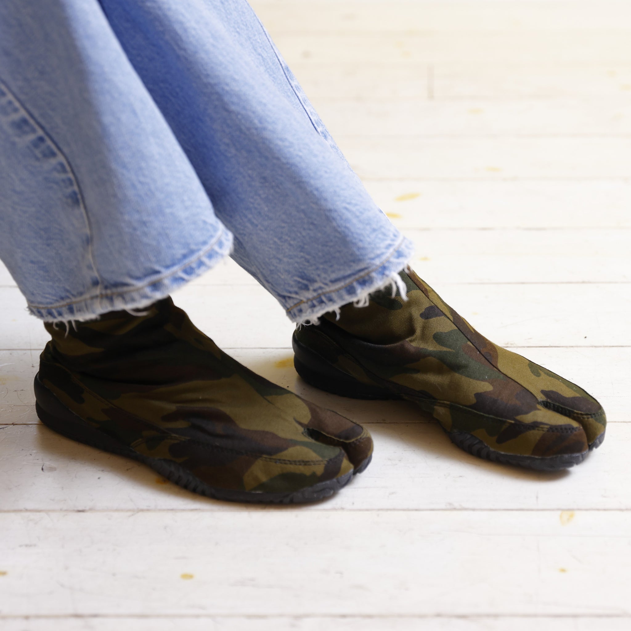 外国人からの人気も高い、足元をよりクールに演出する迷彩柄の足袋スニーカー。軽くて丈夫なスポーツシューズタイプで、ソールがしっかりと衝撃を吸収し、足への負担を軽減します。