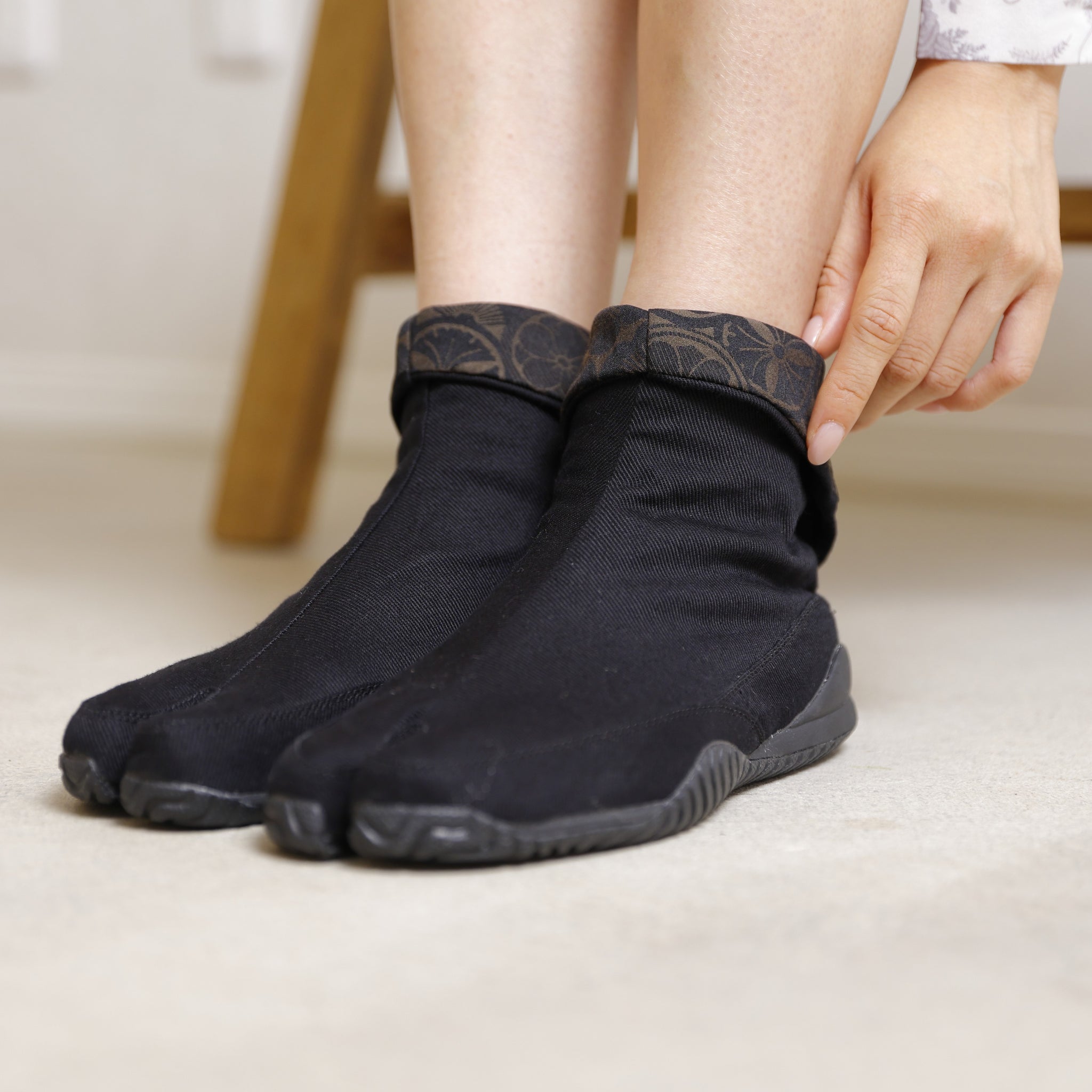 落ち着いたダークカラー配色でありながら、家紋柄が目を引く足袋スニーカーです。履き口を折り曲げずに履く場合はシンプルでありながら洗練されたイメージになります。